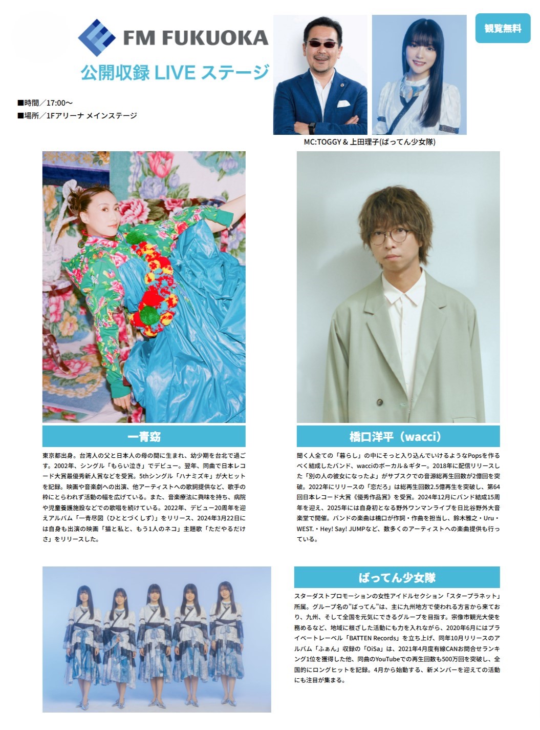 ライブステージには、注目のアーティストが多数登場。Girls²のスペシャルライブパフォーマンスをはじめ、一青窈、橋口洋平(wacci)、ばってん少女隊が出演するFM FUKUOKAの公開収録も開催。