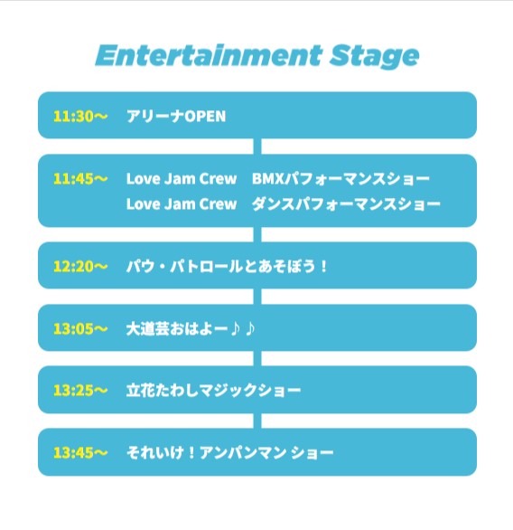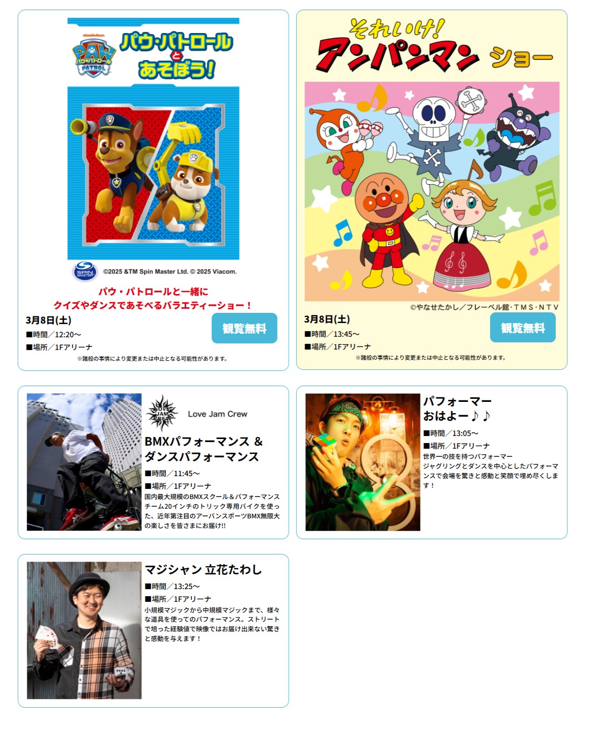 「それいけ!アンパンマン ショー」や「パウ・パトロールとあそぼう!」のステージショーほか、スリル満点の「BMXパフォーマンス&ダンス」、世界一の技を持つパフォーマー、マジシャンなど、さまざまなジャンルのパフォーマーたちが会場を沸かせます。