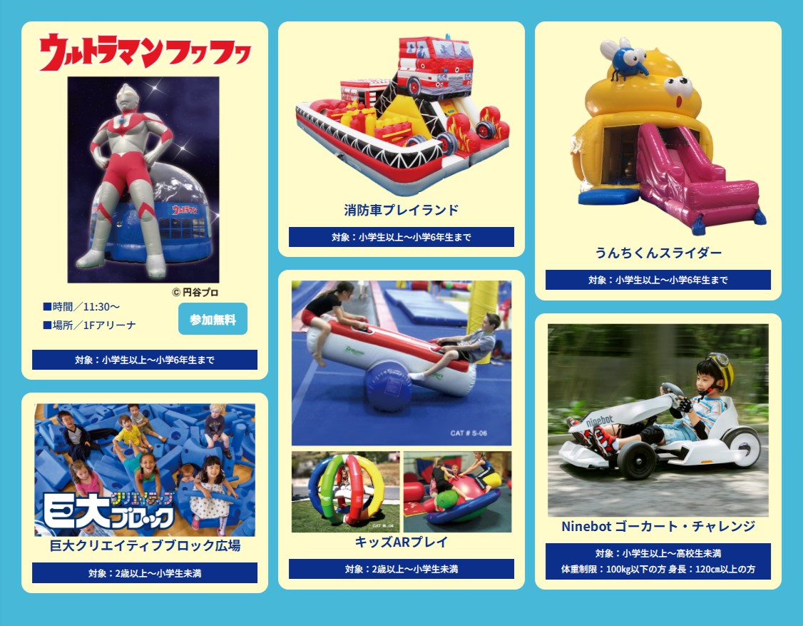 パーク内には、子どもたちが夢中になる魅力的な遊具が大集合。永遠のヒーローがドーム型になった「ウルトラマンフワフワ」や、エア遊具「消防車プレイランド」、ユニークな「うんちくんスライダー」、創造力を育む「巨大クリエイティブブロック広場」も見逃せません。