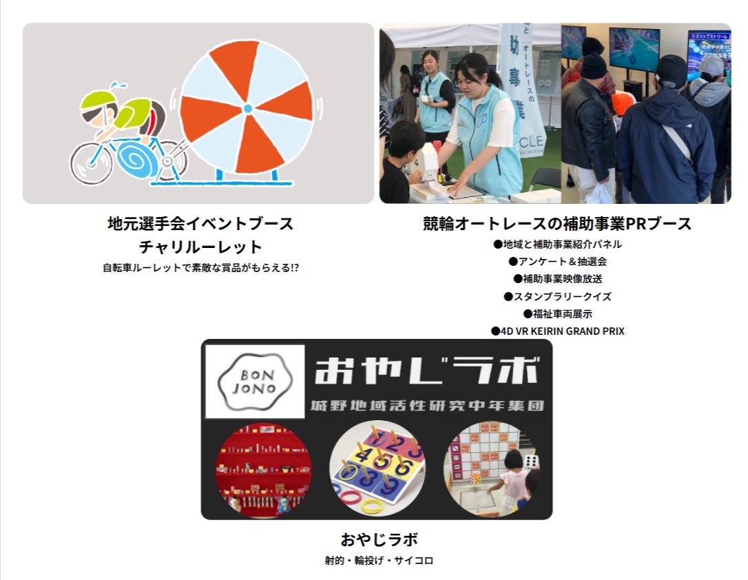 各種出店コーナーでは、素敵な賞品がもらえる競輪地元選手会の「チャリルーレット」や競輪・オートレースの補助事業PRブースが登場。