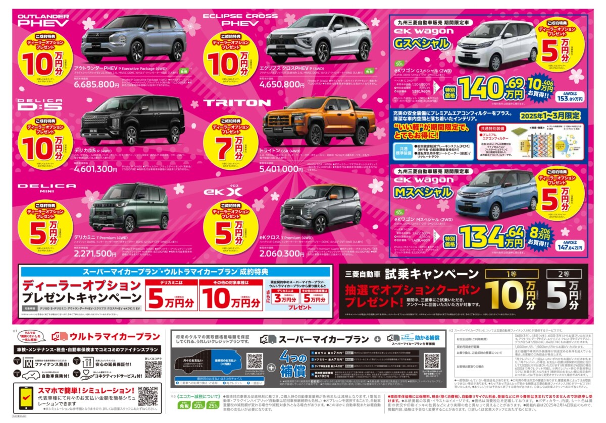 成約者には、豪華なディーラーオプションがプレゼントされます。OUTLANDER PHEVやDELICA D:5、ECLIPSE CROSSの成約で10万円分、TRITONの成約で7万円分、DELICA MINIやeKシリーズの成約で5万円分が用意されています。