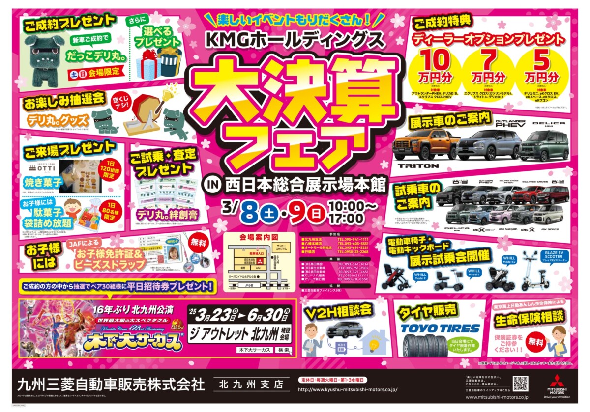 九州三菱自動車販売・北九州支店は3月8日(土)と9日(日)の2日間、西日本総合展示場本館にて「KMGホールディングス 大決算フェア in 西日本総合展示場」を開催します。