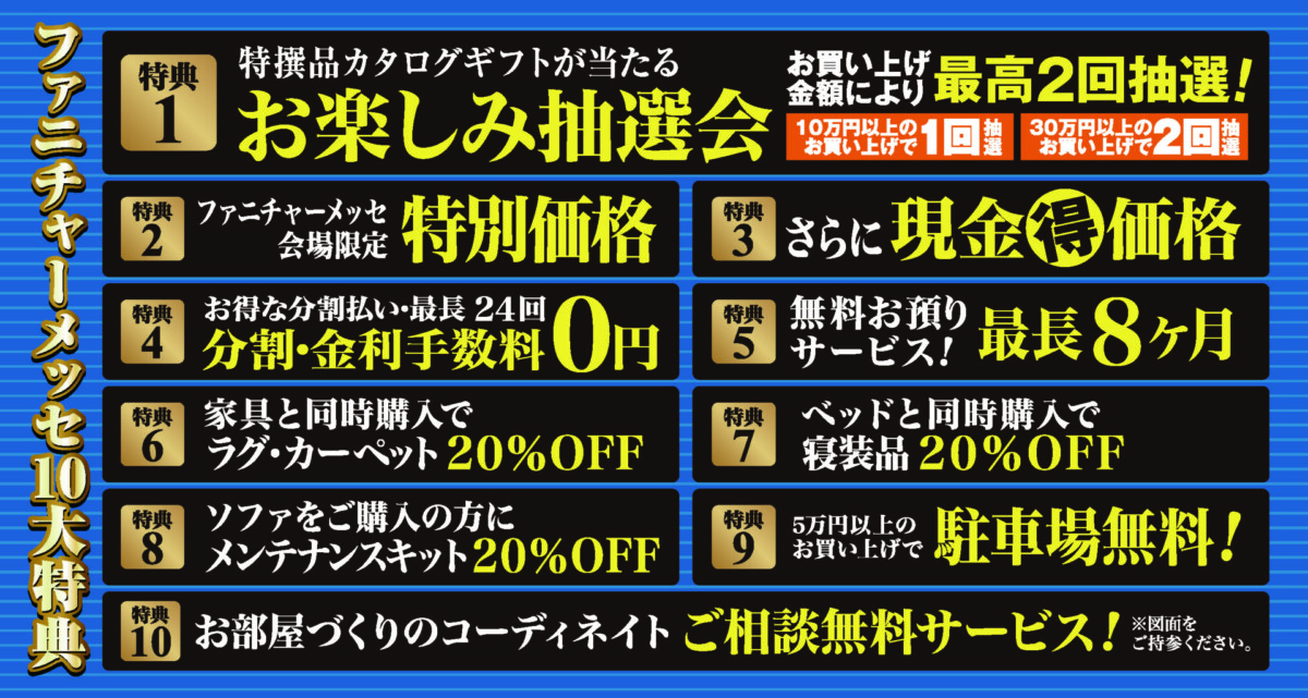 家具を購入された方には、さまざまな10大特典もご用意されています。