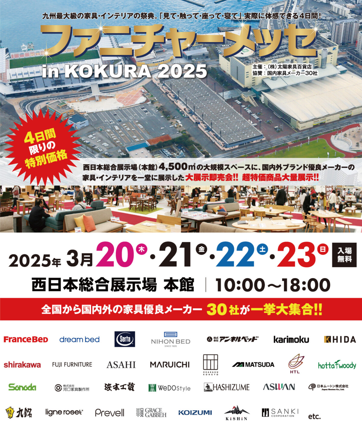 九州最大級の家具・インテリアの祭典「ファニチャーメッセ in KOKURA 2025」が3月20日~23日までの4日間、西日本総合展示場で開催されます。