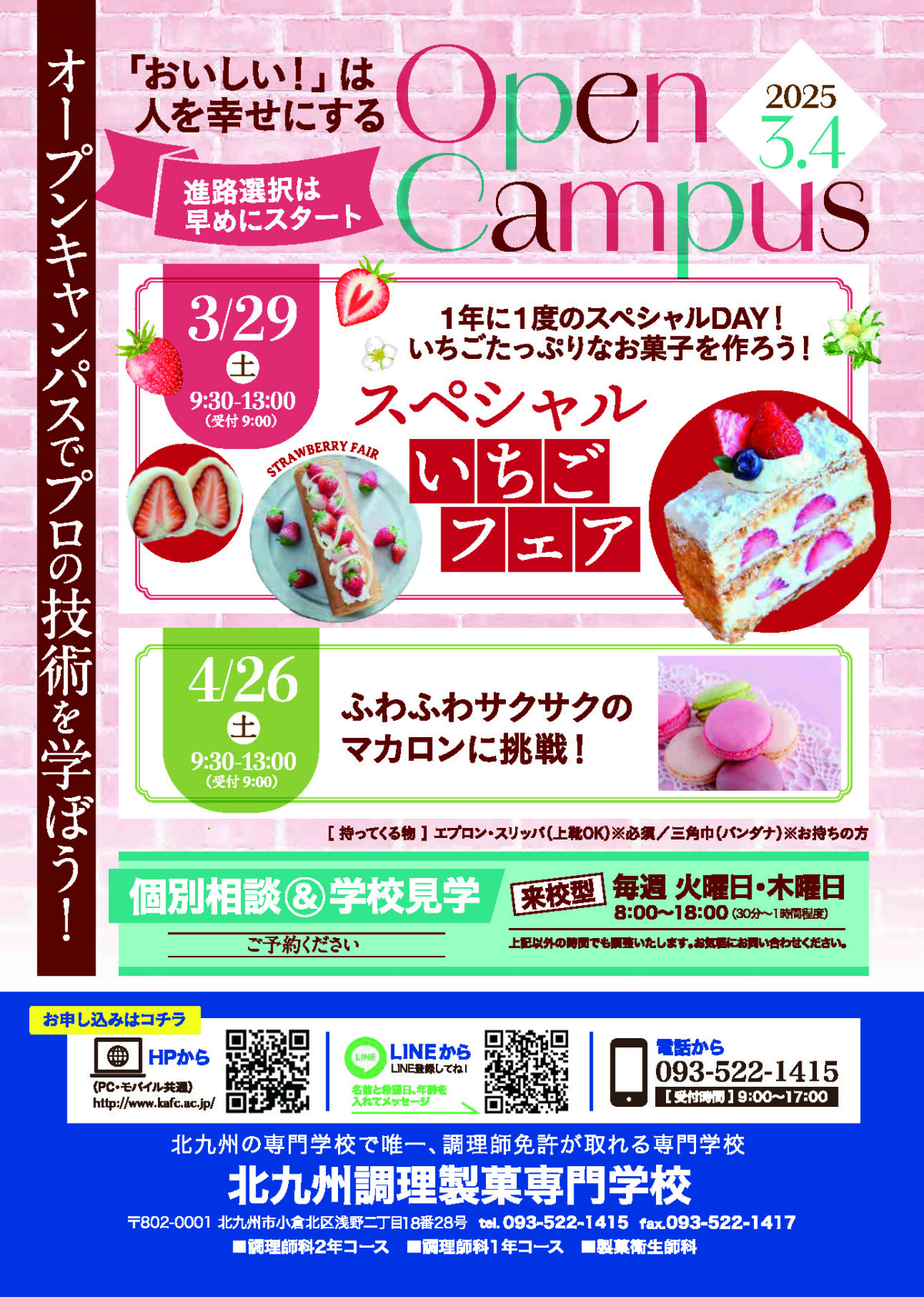 北九州調理製菓専門学校(北九州市小倉北区浅野2-18-28)は、3月29日(土)に調理・製菓を目指す高校1・2年生、進路選択に迷っている高校生を対象としたオープンキャンパスを開催します。