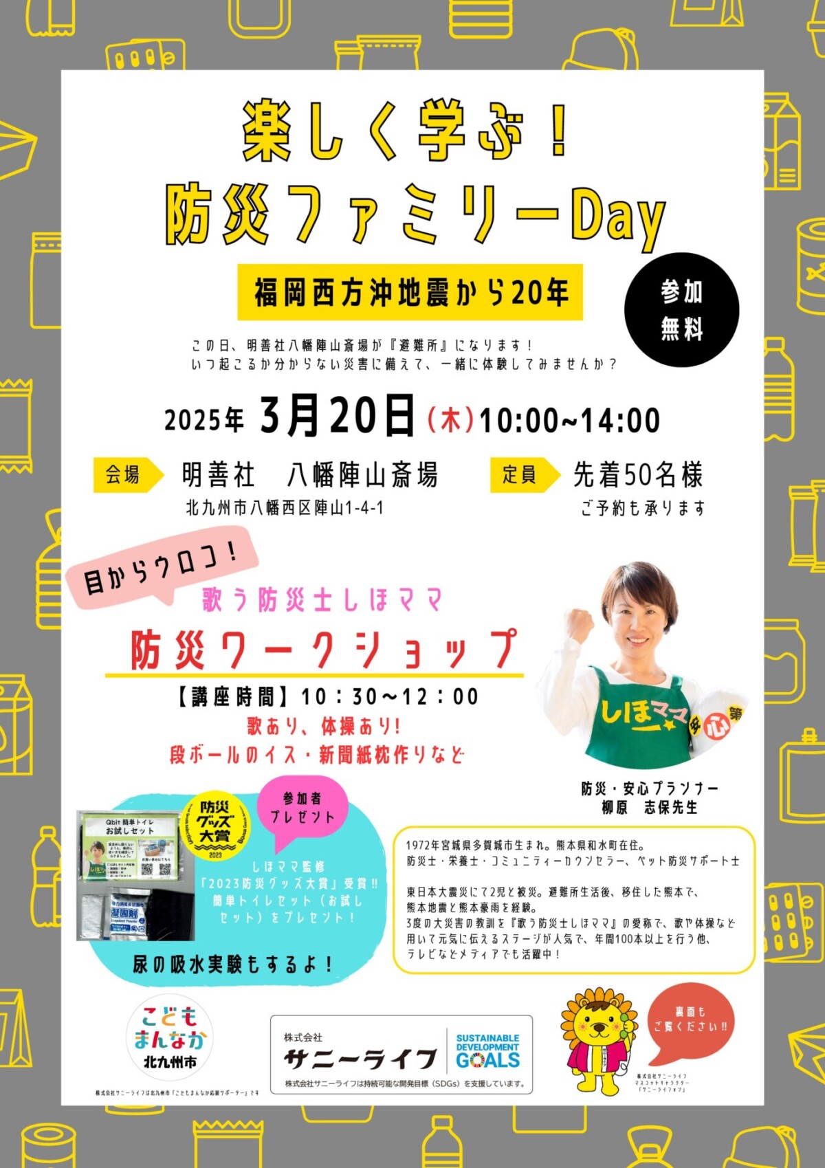 明善社 八幡陣山斎場(北九州市八幡西区陣山1-4-1)で3月20日、「楽しく学ぶ!防災ファミリーDay~福岡西方沖地震から20年~」を開催します。