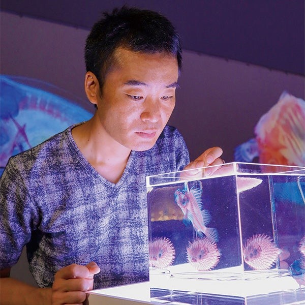 生物でありながら、まるで芸術作品のような美しさを持つ「透明標本」。魚や爬虫類などの生き物を特殊な酵素に長期間浸し、肉質は透明に柔らかい骨は青く硬い骨は赤く染色されています。