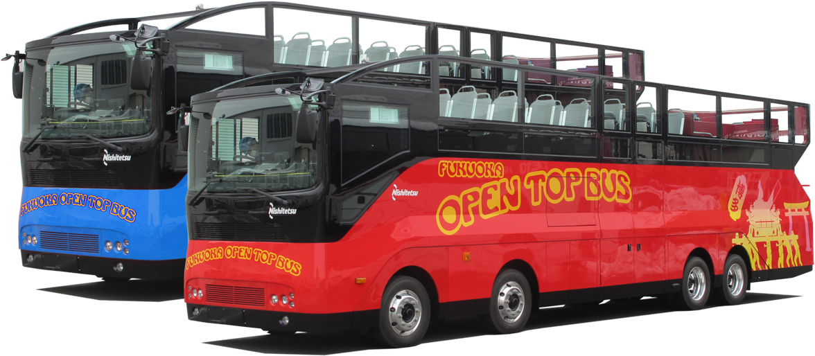 屋根のない2階建て観光バス「福岡オープントップバス」に乗車して、市内を回ります。