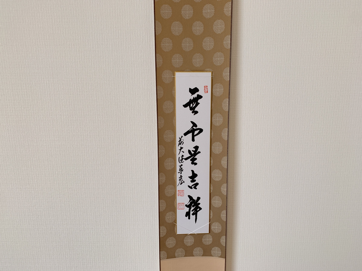 床の間に飾られていた掛け軸「無事是吉祥」は、<何事も無いということは、良いことの現れであり、常に作偽のない素直な心でいることが吉祥を招く>という意味の言葉。