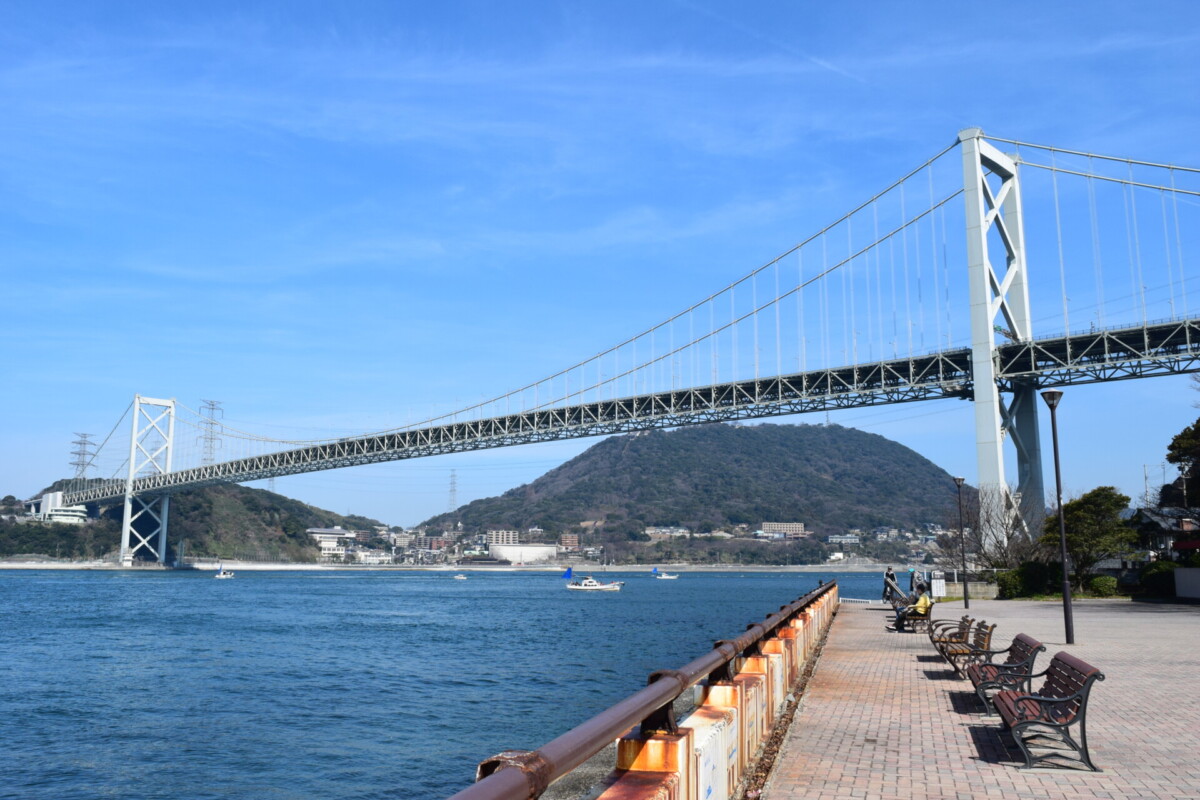 (画像:関門橋)運航コースは、北九州空港乗船場所〜門司港桟橋〜唐戸ターミナル(下関市)。真下から臨む関門橋や国の重要文化財である部埼灯台、陸に背を向けた僧清虚像と正面からの対面など特別航路ならではの景色を見ることができます。