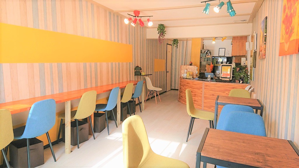 黄色の看板が目を引く一軒家の建物で、店舗の右部分は禁煙スペース、左部分は喫煙スペースとなっています。注文は禁煙スペース側でするため、建物の右側、メニューが貼ってある方の入り口からお店に入ってください。