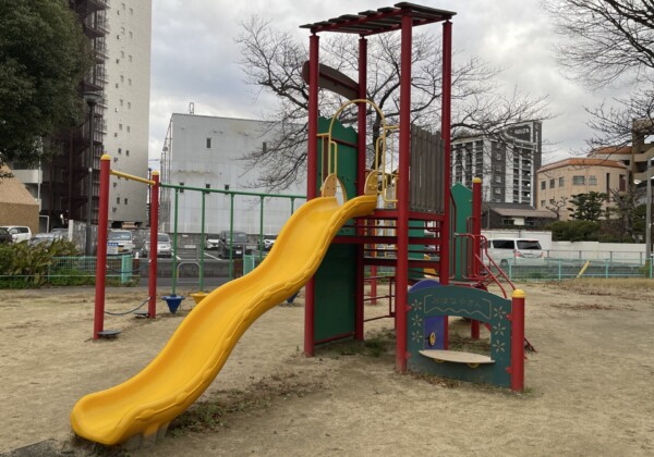 北九州市小倉北区片野新町の住宅街にある「片野新町公園」。 複合遊具のほか、小さい子どもが安心して遊べる柵のついた遊び場や健康器具...