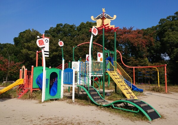 JR黒崎駅から徒歩約10分。「岡田宮」の裏手にある「岡田公園」は、遊具広場とグラウンドを備えた公園です。 神輿がのったコンビネー...