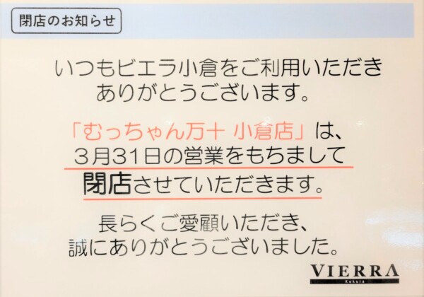 ビエラ小倉の3階にあった「むっちゃん万十 小倉店」が3月31日をもって閉店しました。 福岡市を中心に展開 北九州市唯一の店舗が閉...