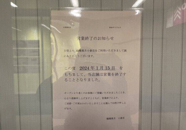 リバーウォーク北九州で営業していたお好み焼き店「鶴橋風月」が1月15日に閉店しました。 現在、入り口には営業終了のお知らせが掲示...