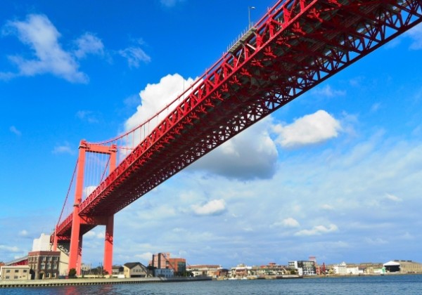 (画像提供:写真AC) 洞海湾にかかる深紅の「若戸大橋」。戸畑区と若松区をつなぐ全長627メートルの大つり橋です。 関門橋や本州...