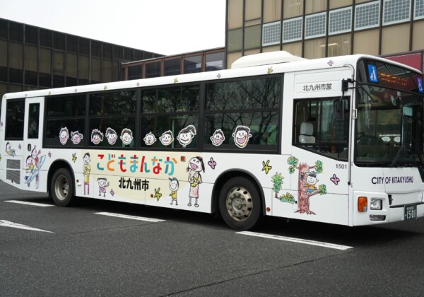 3月25日、北九州市役所1階(小倉北区城内1-1)の勝山公園側駐車場で「こどもまんなかラッピングバス」のお披露目会が行われました...