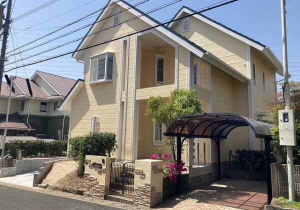 小倉南区舞ケ丘の閑静な住宅街に建つ、淡いイエローの外観が目を引く一戸建て。 一見、新築に見えるこちらの物件ですが、実は1990(...