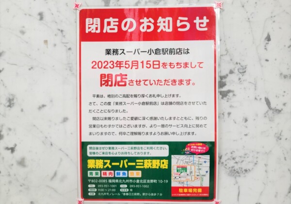 「業務スーパー小倉駅前店」(北九州市小倉北区魚町1-2-10)が5月15日をもって閉店します。 京町銀天街内にあり、立ち寄りやす...