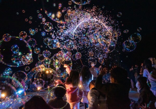 「門司港ナイトバブル」開催 約1万個のシャボン玉で門司港駅が幻想的に